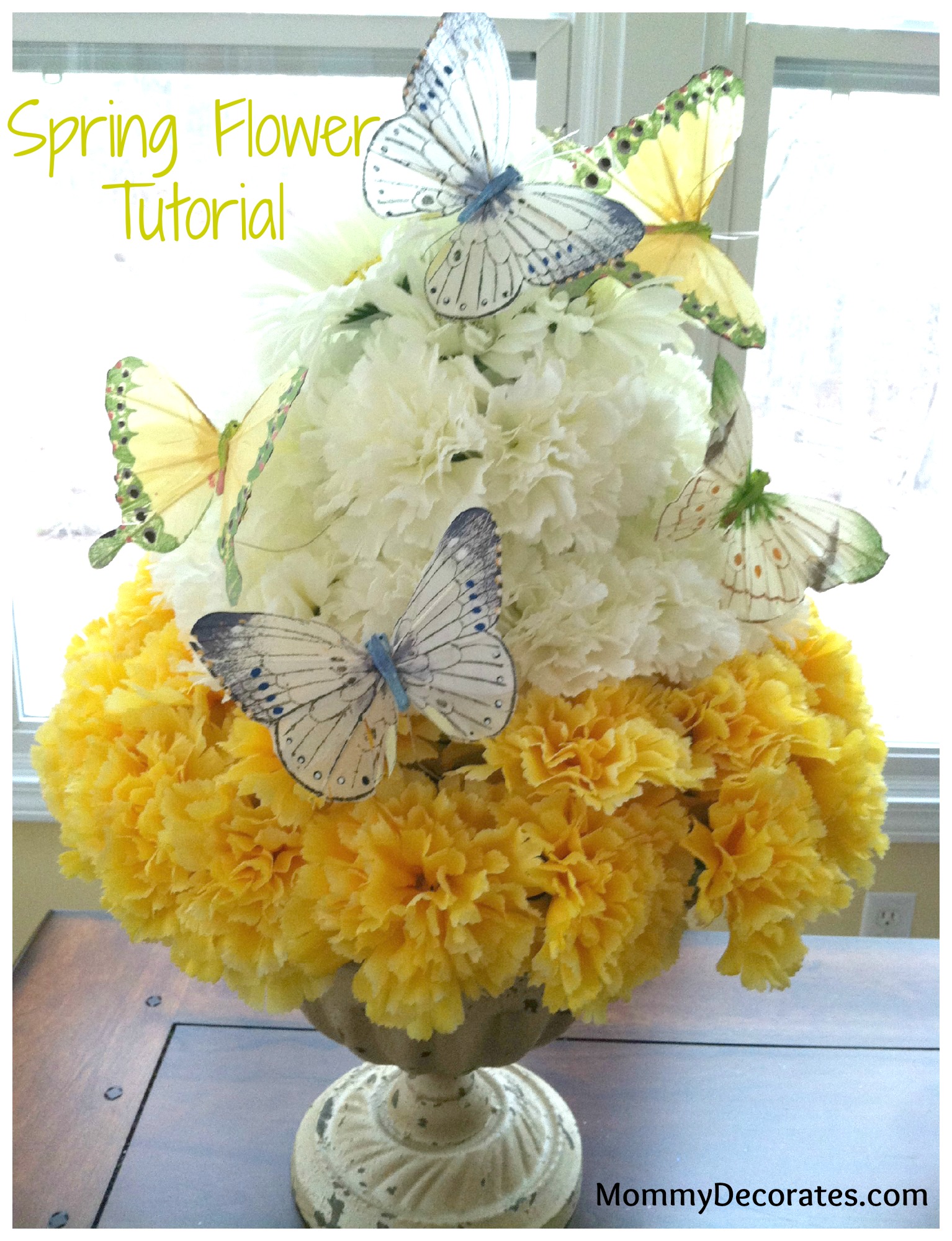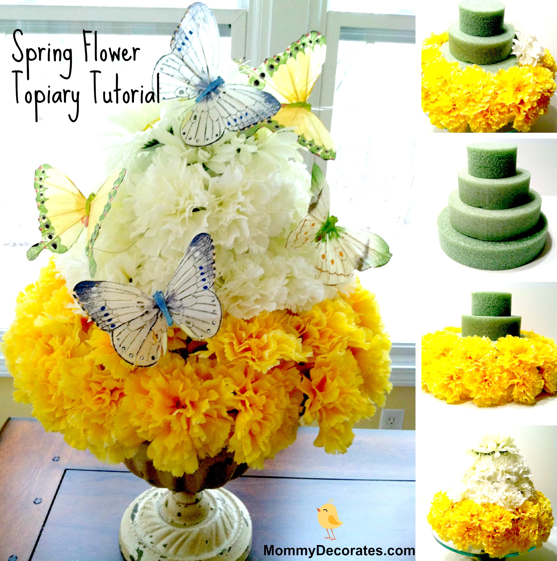 You will feel like a real florist when you make this beautiful “faux” flower cake arrangement for Spring. Just follow along the pictures below to make this quick and simple topiary.